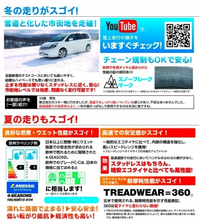ランドセイル4シーズンズって安くて夏冬使えてお得感満載なタイヤなんです。