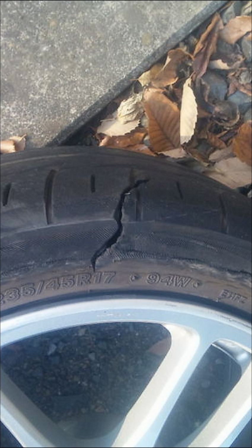 落下した氷の塊を避け切れずに右前のタイヤで踏みバーストしたタイヤの写真です