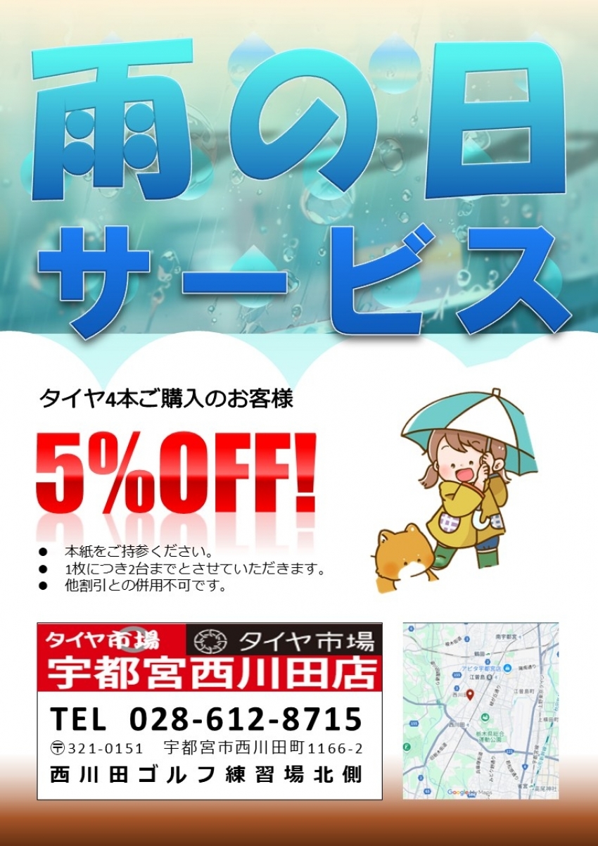 雨の日にタイヤ市場宇都宮西川田店でタイヤ4本ご購入のお客様に限り